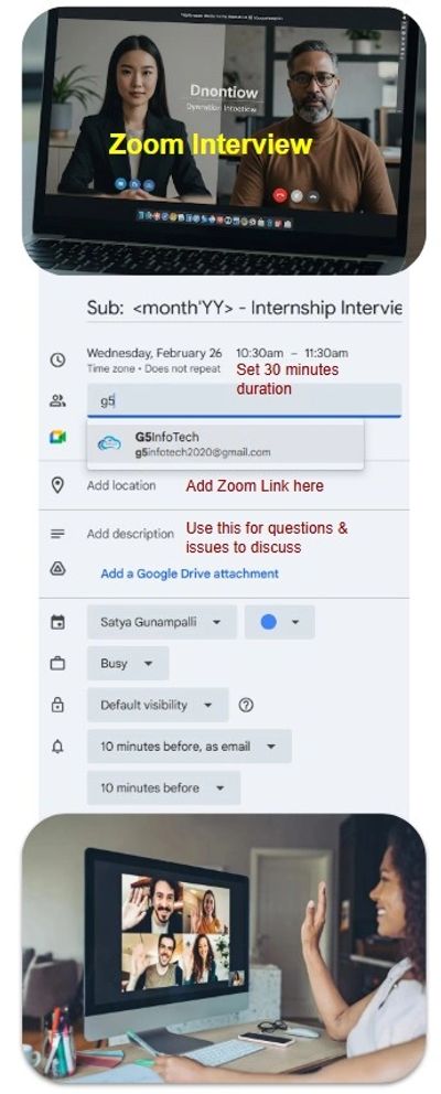 To setup Interview call, use the following steps to setup a calendar invite with G5InfoTech2020@gmail.com If you don't have a gmail id, please create one. We collaborate using Google Docs only for the entire internship. Please include github URL, Linkedin Profile and a cover letter also. You may watch youtube videos to learn more on how to do this.